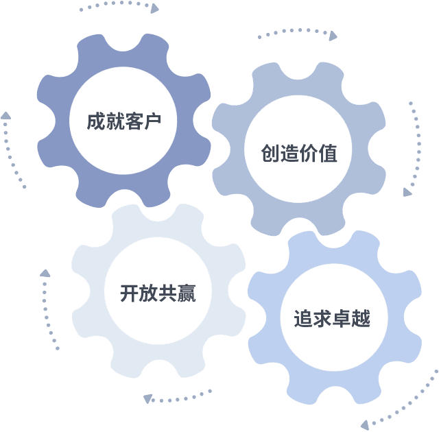 成就客户是一切决策的出发点,,,,创造价值是衡量所有工作的标准,,,追求卓越是jbo竟博电竞做事做人的态度,,,,开放共赢是jbo竟博电竞的格局也是最终的结果。。。。价值观的齿轮环环相扣,,推动着组织里的每个人不断向前。。